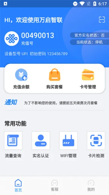 万启智联是河源市屹然电子科技有限公司自研的多功能APP。支持三网话费流量充值、余额流量查询、套餐办理等,有在线客服。操作简便,信息安全,还能智能诊断设备,满足多样需求 。