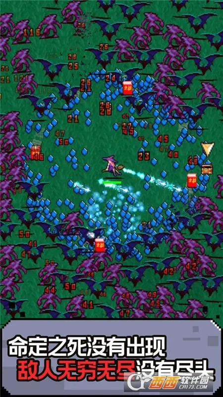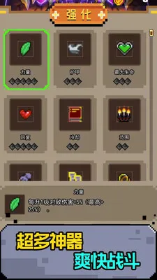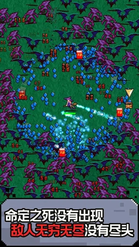 1、肉鸽割草竞技,玩家操控角色在像素场景中射击,孤军奋战面对不断涌现的敌人,通过打败敌人收集经验值获取装备、升级武器,体验炫酷射击玩法。