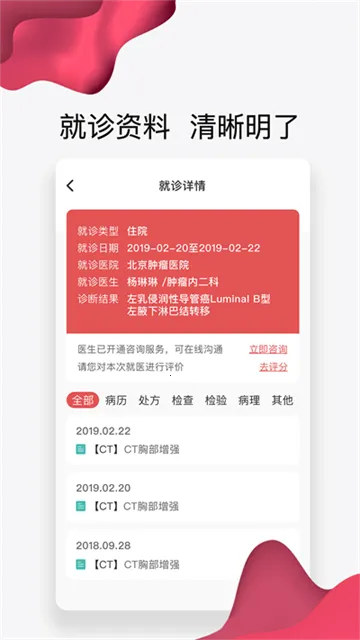 1. 智能病历管理:自动同步就诊记录,按病历、处方、检查等分类归档,支持拍照上传药品及病历信息,方便患者回顾与查阅。