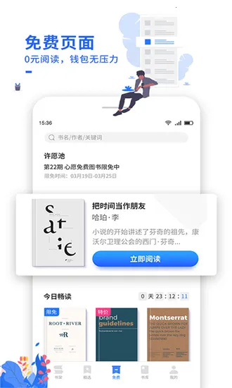 4. 会员福利体系超诱人,全站免费阅读、听书、下载,签到、任务中心能获积分代金券,限时免费专区每日更新好书。