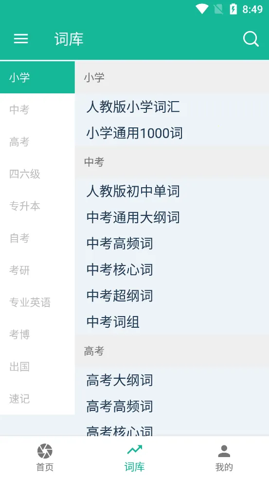 3. 拥有丰富的单词词库,涵盖各个年龄段所需,从小学到考博等各类词库都有,学习资源很全面。