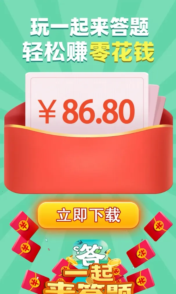 想知道答题能不能赚钱?一起来答题这款游戏就能满足你!它是一款超有趣的红包小游戏。游戏里有成语填字、找茬、看图猜词等丰富内容任你选。你能从底层一步步升官发财,答对题目就能解锁成就,还能和好友比赛,看看谁知识储备多。这里题目种类丰富,题库量大,涵盖天文、地理等多方面知识,能让你边玩边学。操作简单,手指点击选项就能答题。只要答对足够多题目,积攒的金币就能兑换红包,实现边玩边赚。而且它还有限时模式增加挑战乐趣。游戏画面有浓厚古代传统学堂画风,融入Q萌音效,让你更沉浸。不管你是知识渊博还是普通玩家,都能在这玩得开心,轻松赚钱又涨知识,快来下载体验吧!
