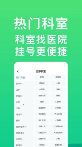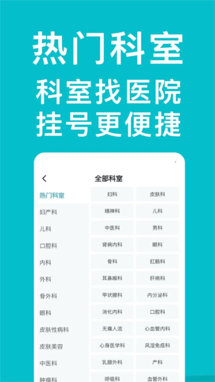 1、医院挂号通app支持用户轻松查找医院进行挂号,收录了全国多家医院特色科室,能快捷查找更多热门科室和医生。