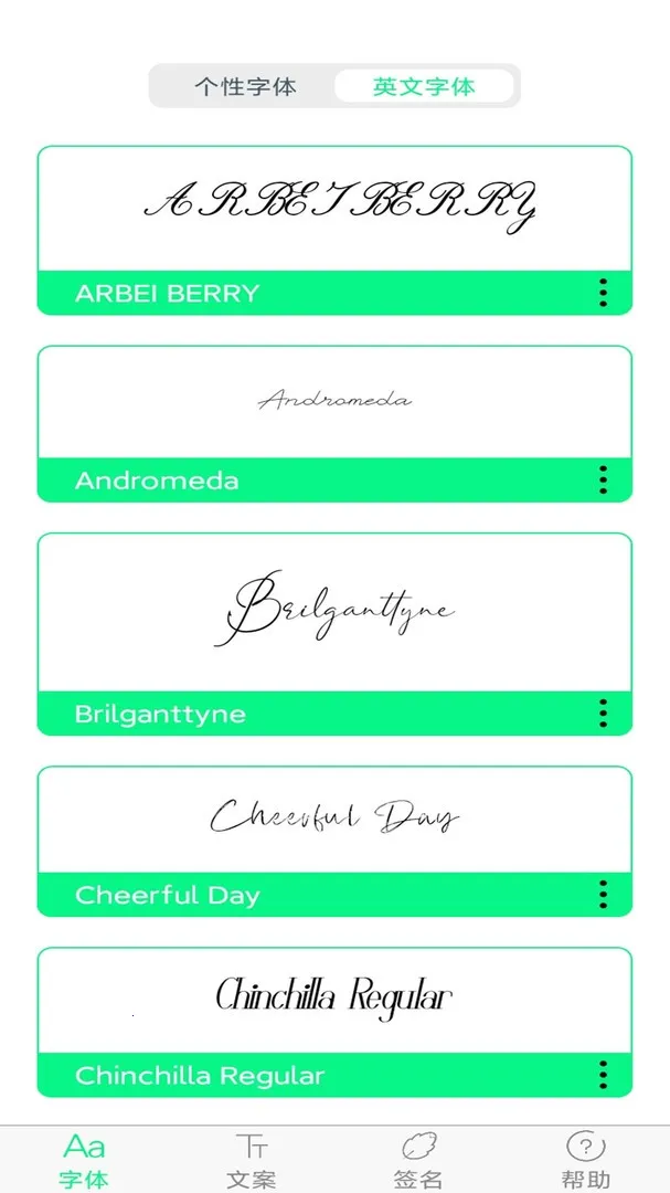 3. 字体多样,精选七十二款简、繁、英美化字体,涵盖多种热门字体,每天新字体上线。