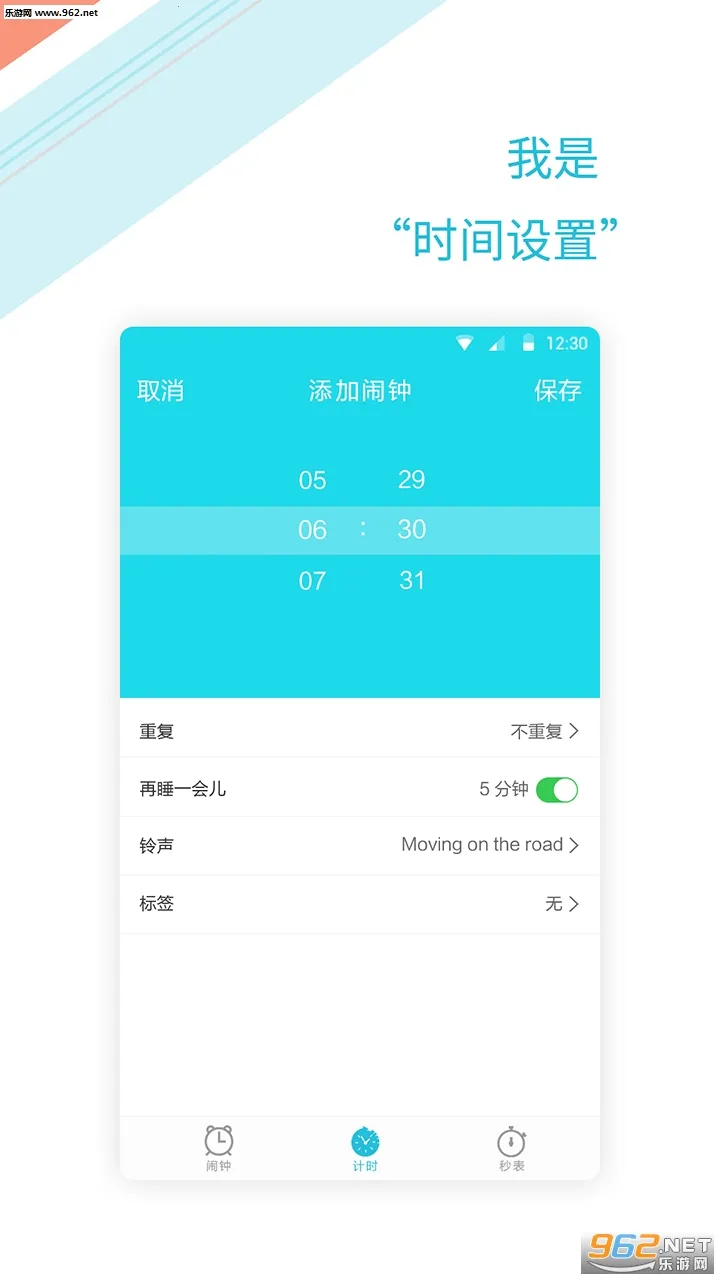 2. 支持自定义设置,如闹钟响铃时间、重复周期、响铃方式,还有丰富闹铃曲库可自选音乐设置闹铃。
