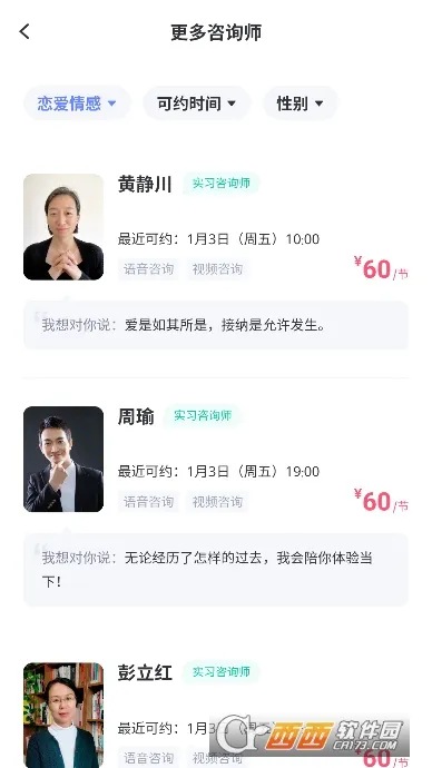 1. 专业权威:平台对心理咨询师严格评估筛选,确保服务质量,为用户提供高质量咨询服务。