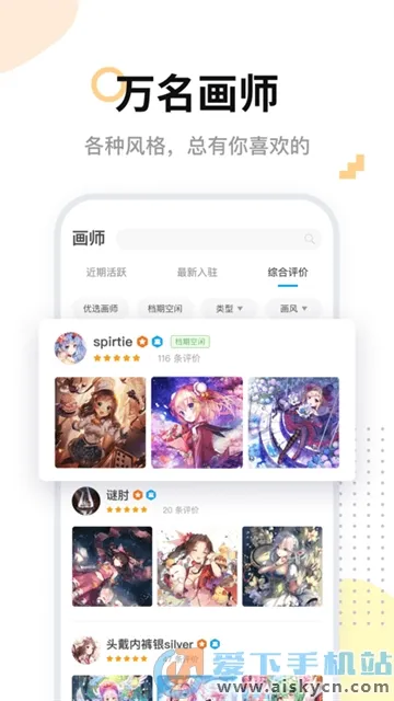 1、海量画师资源,30000余位精选画师,涵盖各式风格。