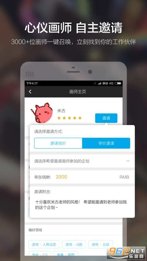 米画师是专业约稿平台,为企划方和插画师服务。有海量精选画师,风格多样。提供安全交易担保等功能,有便捷管理工具,支持在线沟通。更新不断优化体验,满足美术外包及约稿需求 。