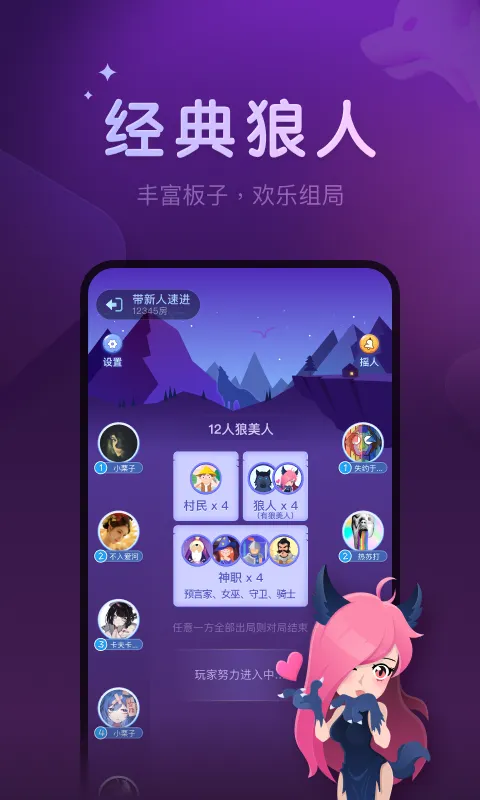 微派狼人是海南玩友网络推出的社交手游,集多种桌游玩法。有丰富角色和多样场次,支持语音交友、拜师收徒等社交互动。含新手教程,实时匹配,能边玩边提升推理能力。