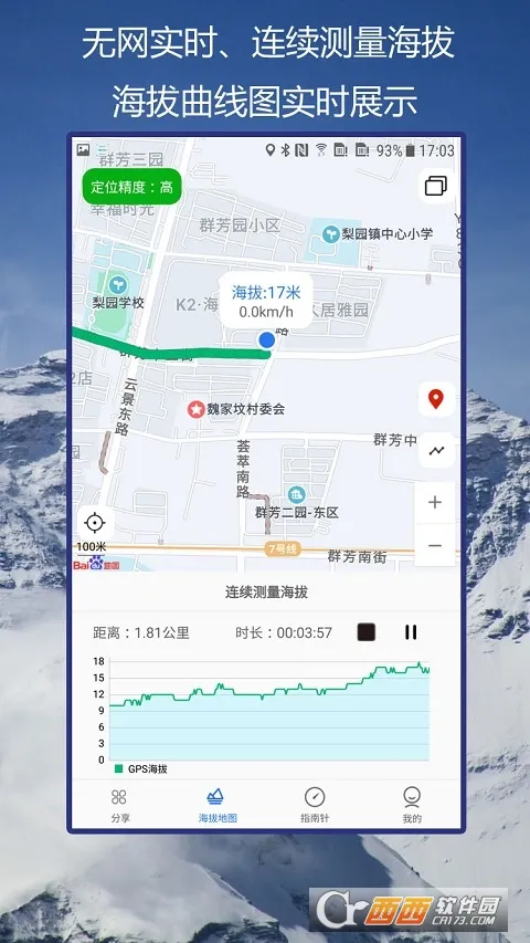 2、后台记录贴心,切换到后台也能持续记录轨迹、测量海拔和速度,长时间户外活动不中断。