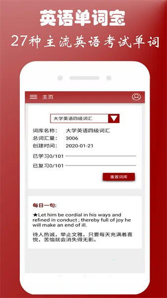 英语四级单词宝安卓版专为英语考试打造,功能丰富,依科学方法安排复习计划,有多种学习模式与测试模块。无需注册上网,按记忆曲线提醒复习,含多种特色功能,还不断更新优化。