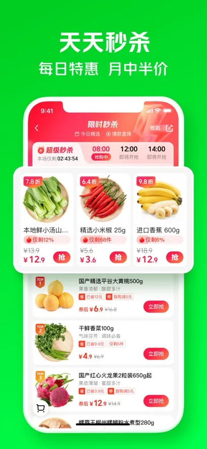 1、新鲜速达:距线下1.5公里范围内支持最快30分钟送达服务,让你快速享受新鲜食材。