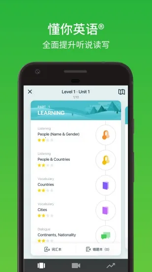 2. 课程内容紧贴生活场景,像日常对话、商务沟通、旅行用语等都有涵盖,助用户在各场景自如表达。