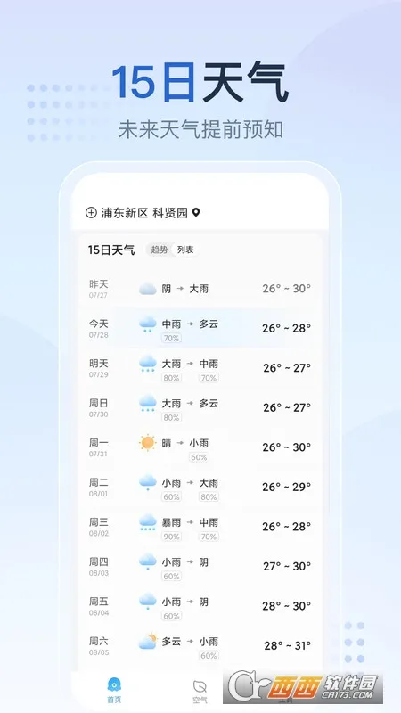 3. 走势清晰:点击底栏预报按钮,可浏览未来多日天气走势,包括降雨概率和温度范围,助您提前规划出行与衣物搭配。