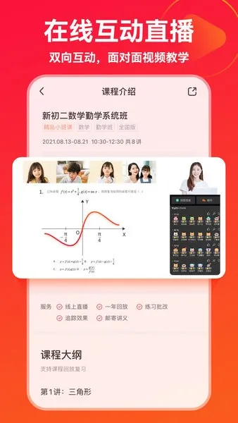 1. 课程由专业老师授课,系统化讲解,在线直播互动,能与高级教师实时交流,突破重难点。
