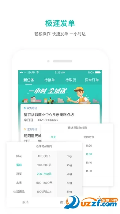 2. 操作方便:一键发单,智能录入地址,下单支付接单送达全程快速省时,收发单地址预览,随时随地下单。