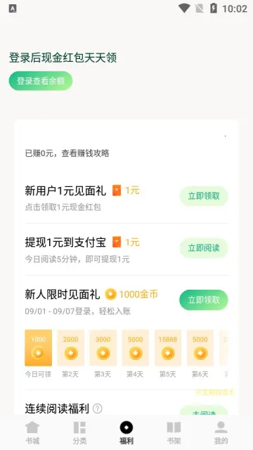 4. 福利很诱人,签到阅读能赚金币,提现秒到账,完成任务还有现金奖励。