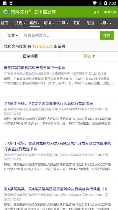 2. 检索智能:关键词输入后相关法条案例快速呈现,还能按时间、地区、法院筛选,精准定位。