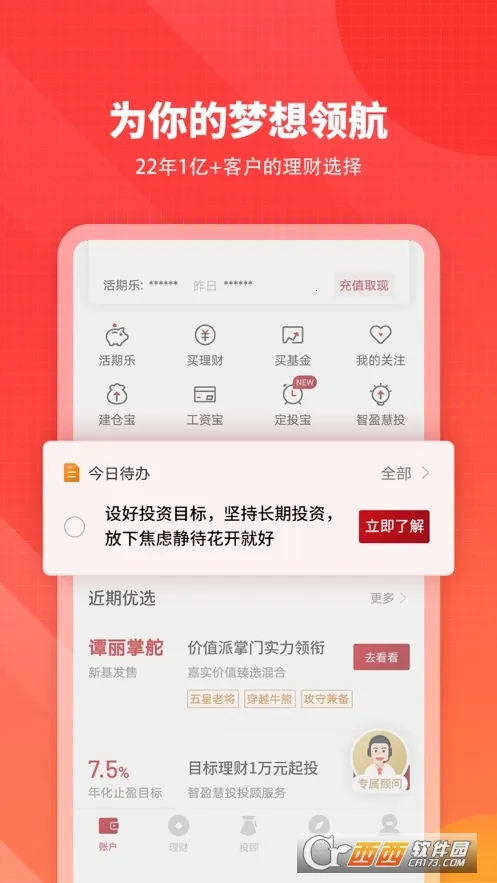 嘉实理财嘉2026最新版本是嘉实基金官方推出的智能理财服务平台。支持一键管理,涵盖交易记录、信用卡还款等。有投顾服务、基金定投等功能,提供丰富理财资讯,安全便捷助用户实现财富稳健增长。