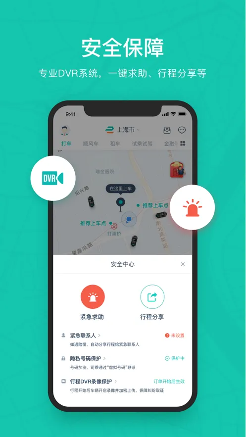 2、安全保障令人安心。司机经过深度背调、人车统一,且平台网约车双证齐全。还有一键紧急呼叫、行程分享等多重安全保险,加上DVR智能识别等系统数据支持,出行更放心。