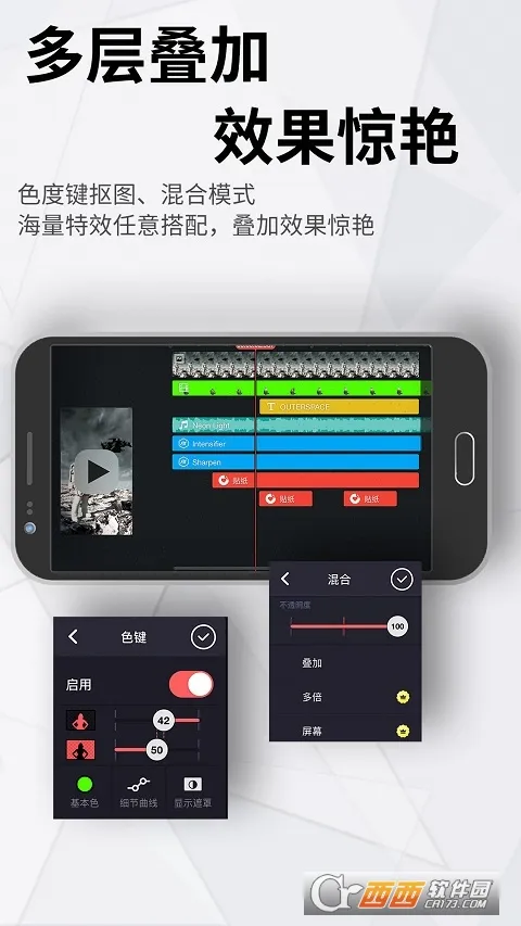3. 支持多图层编辑,创新背景抠像技术,每月更新素材,让创作更丰富。