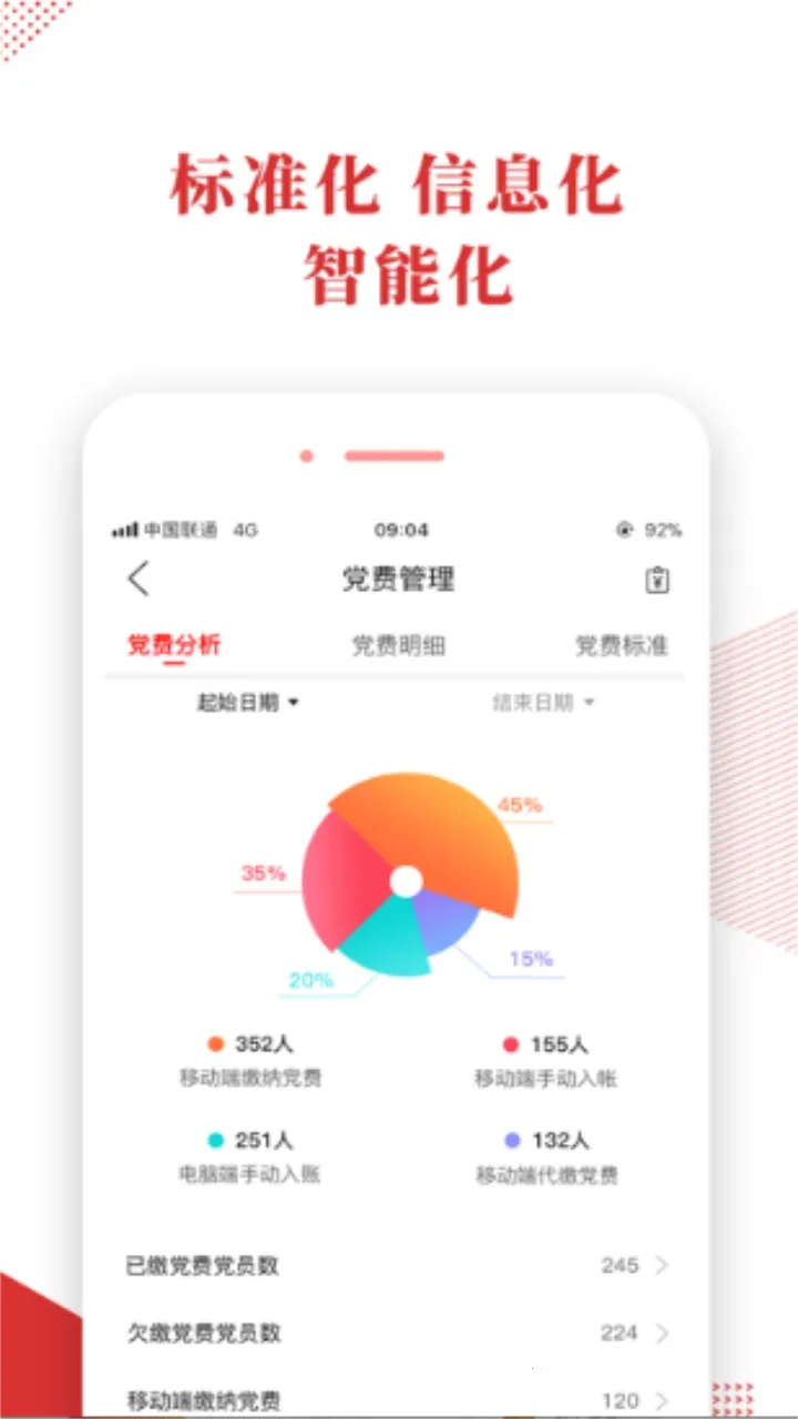 3、开展便携式党务管理,覆盖党员发展全流程,包括党课培训、党费财务管理等。