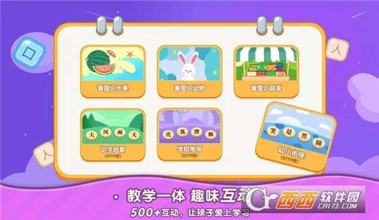 2. 一键切换学习内容,可查看对应汉字图案及代表对象。