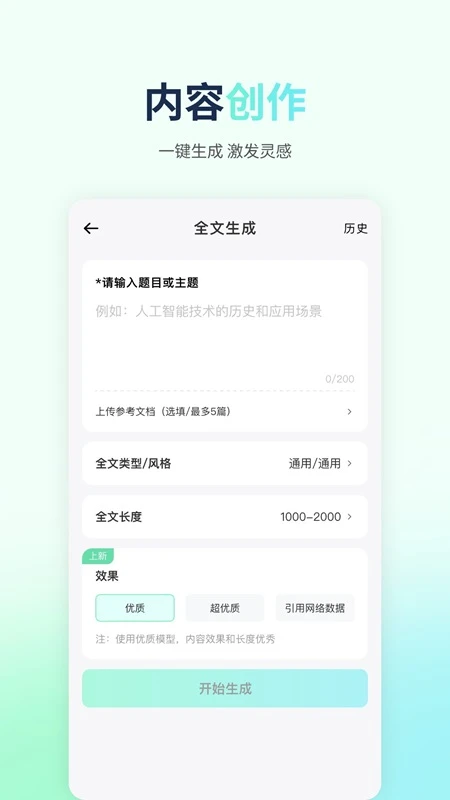 3. 生成历史记录:会实时保存文章生成历史,便于用户日后随时查看过往创作,方便回顾和管理自己的作品。