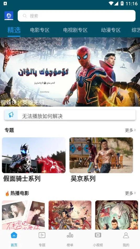 1、进入应用主页后,可在精选、电影、电视剧及动漫专区浏览分类内容。