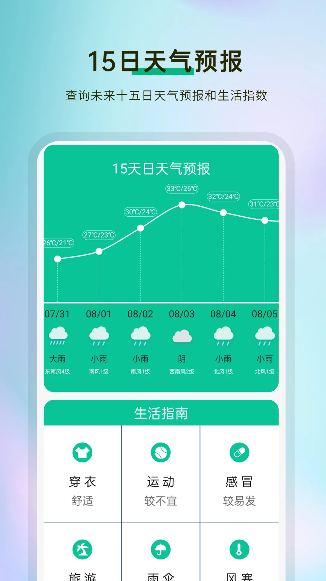 1. 实时掌握 24 小时及 15 天天气预报,涵盖气温变化与生活指南,精准规划出行行程。