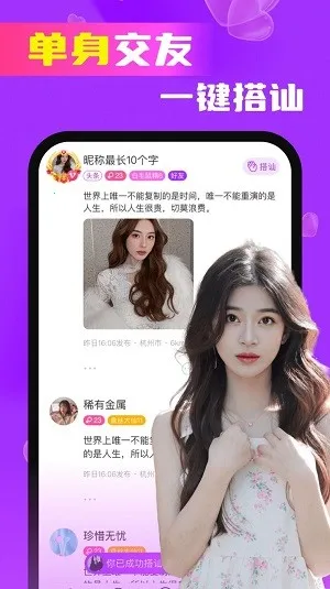 “走心交友”就是能让你真心交流、找到契合灵魂的交友方式。这类软件功能超棒!它能根据位置显示附近的人,方便你结识身边有缘人。还能实时分享生活点滴,展现最真实有趣的自己。软件提供一对一聊天室,智能匹配对象在线畅聊,轻松找到合适的人交朋友。在相互尊重的良好氛围里,大家能自由交流。你可以随时给感兴趣的人发信息,彼此喜欢后就能愉快聊天啦。它能帮你解决想找真心朋友、找另一半的需求,让你不再为孤单烦恼。不管是想拓展社交圈,还是期待浪漫爱情,在这里都有机会实现。随时开启聊天体验,轻松结识更多有趣的灵魂,找到属于你的走心社交之旅。