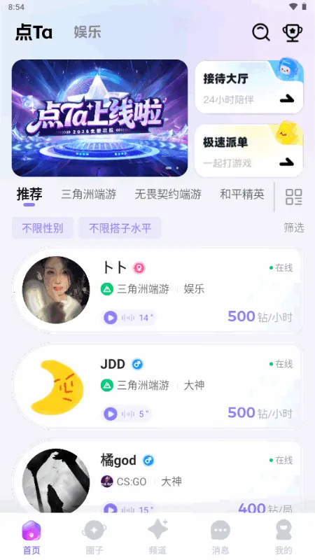 点Ta2026最新版本是一款功能丰富的陪练陪玩软件,为游戏玩家和社交爱好者打造。有专业电竞搭子、娱乐陪玩,涵盖多热门游戏,还有24小时Live驻唱、海量播客,及多种交友方式,体验轻盈高效。