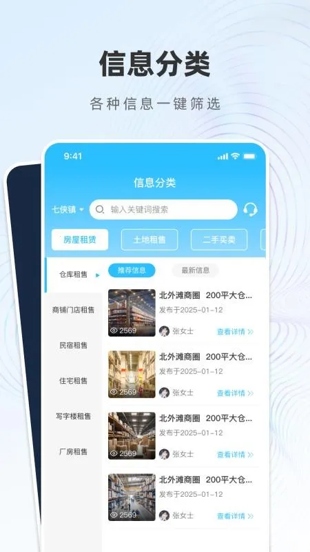 新租客2026最新版本是租赁信息平台,提供房屋、土地、汽车等租赁内容。有详细分类,可一键筛选,支持全国租赁信息查询,能快速沟通,让找租赁资讯更轻松。