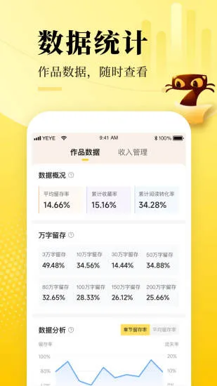 2. 能查看作品平均留存率、累计收藏率、累计阅读转化率、万字留存、章节留存率等,助创作者洞悉作品表现。