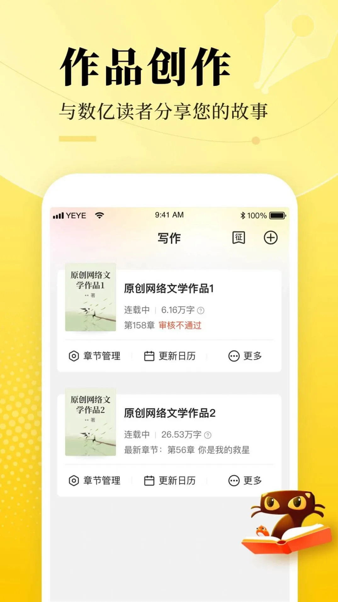 七猫作家助手能让创作者轻松开启新作品,上传章节,还可直观查看更新日历,让灵感与创作无缝衔接,随时随地享受移动创作的乐趣。
