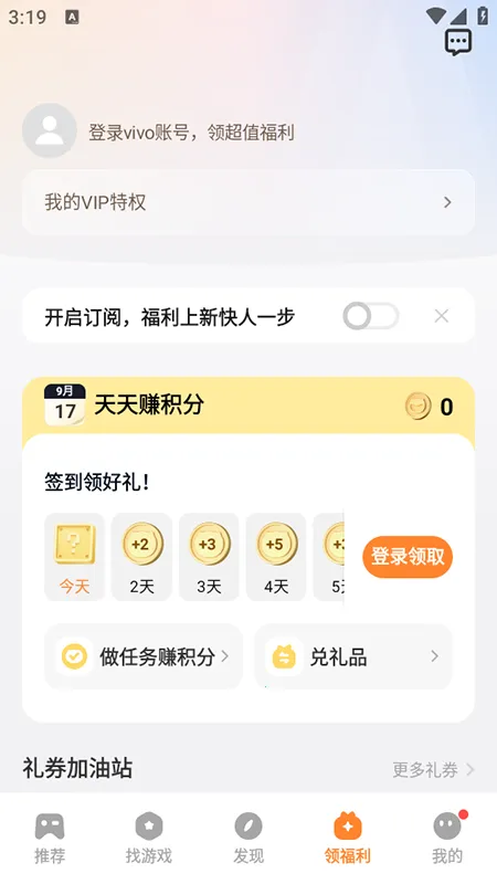 4. 领福利界面能领游戏专属福利,还可查看正在玩、预约或关注的新游。