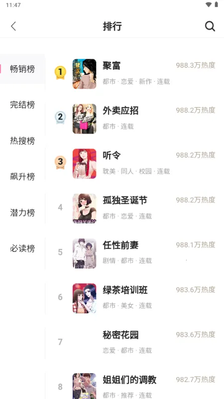 3. 漫画类型极为丰富,包括日韩少女、热血动作、悬疑惊悚、科幻耽美等各类题材,天天更新,可轻松追不停。