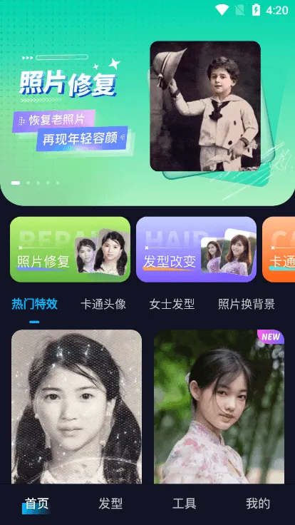 3. 有多种新颖修图功能,如老照片修复、一键变换卡通头像、一键换装古风美人等。