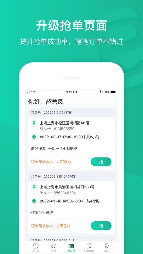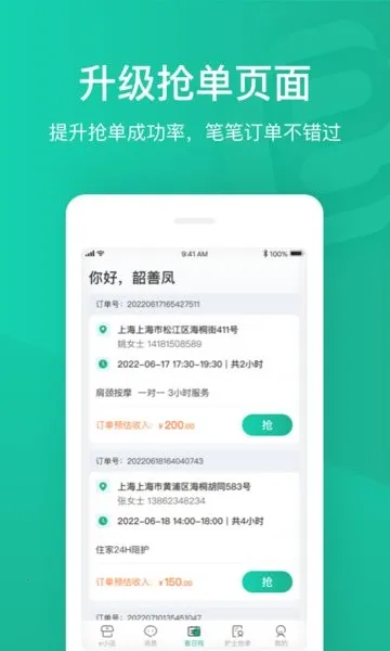 2. 自由接单,可根据自身工作安排,选择不同服务时间的订单。