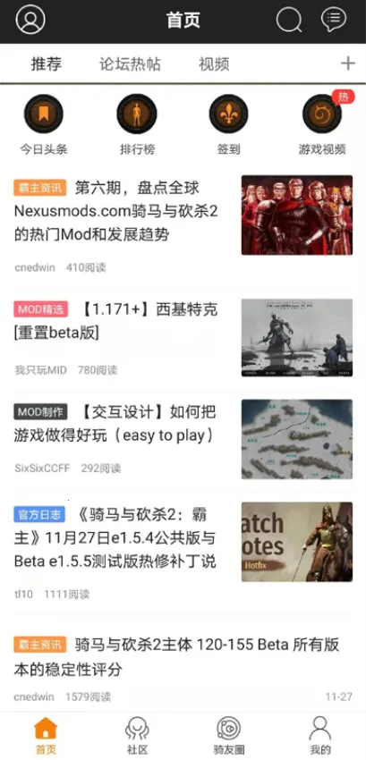 骑砍中文站app是骑马与砍杀玩家的资讯论坛,汇集海量信息且实时更新。提供汉化MOD下载,有社区交流心得攻略,还能下载游戏安装包,涵盖及时资讯、攻略、视频等功能,全方位满足需求
