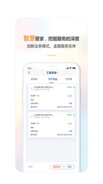 对于企业来说,它更是强大。能实现线上协同办公,企业级内部通讯、办公协同及 OA 事项都能通过手机 app 搞定。比如给员工发工资、购买理财产品,具备财务审核、资金管理、转账汇款等服务,还能查询所有账单记录。开户流程简便,有线上预约、远程视频双录等方式。服务贴心又高效,财务管控规范,算税报税精准,事务提醒实时。管钱便捷安全,支付结算顺心,财富管理省心,融资服务舒心。有了兴业管家,个人和企业的财务管理都能轻松不少,快来试试吧!