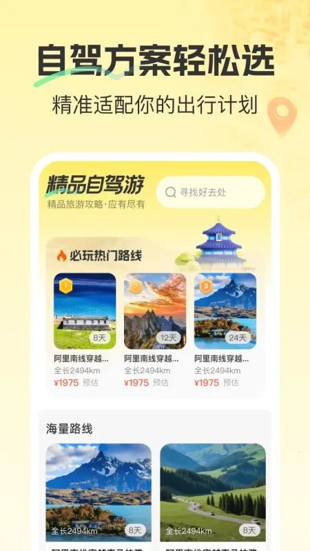 1. 提供丰富自驾路线,海量方案轻松选,精准适配出行计划,让出行更便捷。