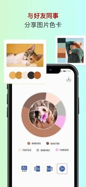 3. 支持导出到相应软件,点击图片选色,具备下载分享、在线搜索和配色卡编辑等功能。