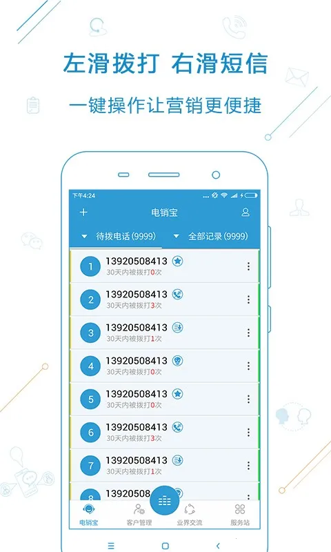 电销宝是一款超棒的电话销售办公软件,专为电销人员打造。它功能强大,能解决不少实际问题。智能拨号一键搞定,支持自动拨号和挂机检测,大大提高通话效率。通话自动录音存档,保障通话质量与客户信息安全。任务管理方便创建与分配任务,还能跟踪进度,确保事项无遗漏。业绩统计实时呈现销售数据,直观展示业绩趋势。团队协作让成员信息共享,协同完成销售目标。智能回访能设置闹铃,客户一个都不会漏。智能备注可把客户情况记清楚。还有业界交流平台,能分享行业经验。拨打统计能让你清楚了解自己工作状况。多种导入方式轻松录入数据,数据优化可筛无效数据。有了电销宝,电销工作更高效、有条理,强烈推荐下载体验!