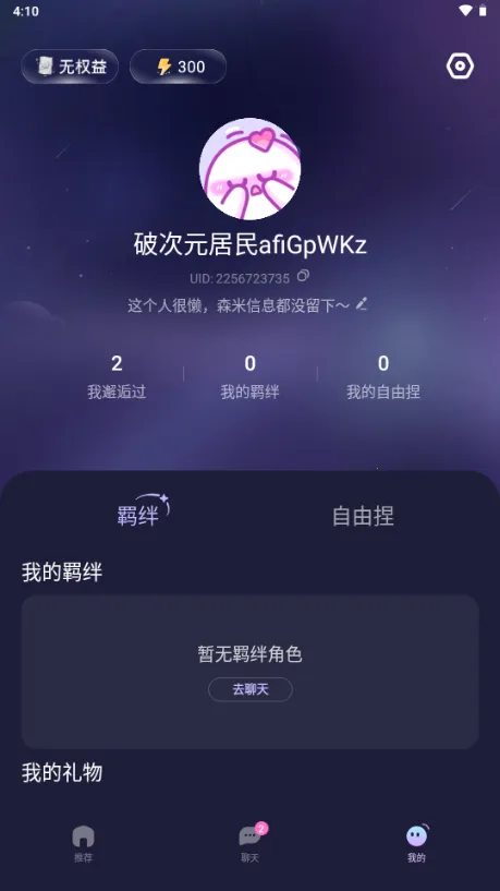 对于想关闭青少年模式的朋友,通常在APP的设置选项里能找到相关入口。若没找到,也可在软件主界面仔细找找类似“模式设置”“安全设置”等选项,说不定就能轻松关闭青少年模式啦。有了破次元恋人,你随时能和魅力十足的角色交流,享受趣味玩法,实现全天候暖心相伴,还能个性化打造专属角色,解决你日常的无聊,带来超棒的陪伴体验,赶紧下载试试吧!