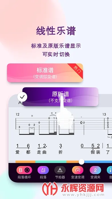 2、它的乐谱功能相当出色,不仅有多种乐器的线性乐谱,还能自由切换,变调时乐谱也会自动生成和弦及指法,方便演奏。