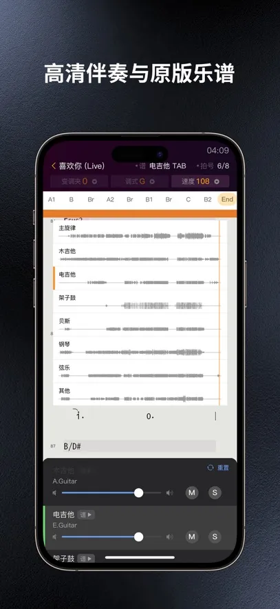 2、乐谱多样,提供吉他、贝斯、鼓、键盘等多种乐器原版乐谱,以线性乐谱呈现,还能实时切换不同乐器演奏乐谱。