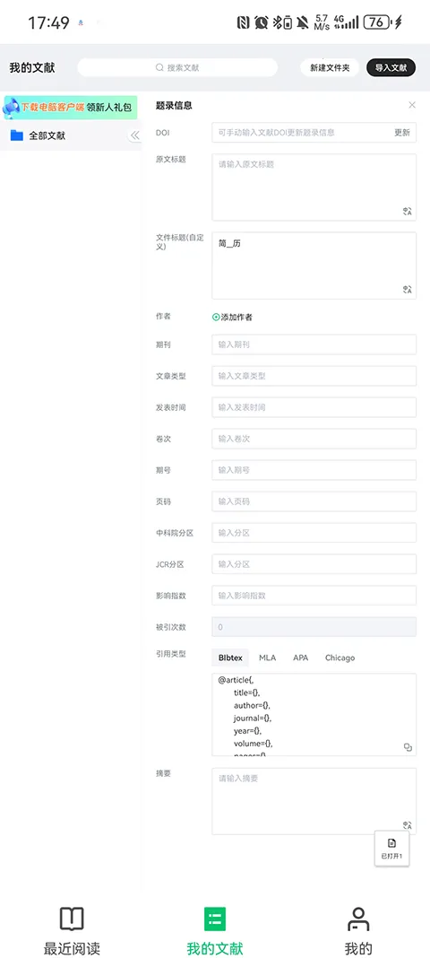 3. 文献题录信息展示,无限级新建文件夹,管理标签筛选搭配智能搜索,精准锁定文献。