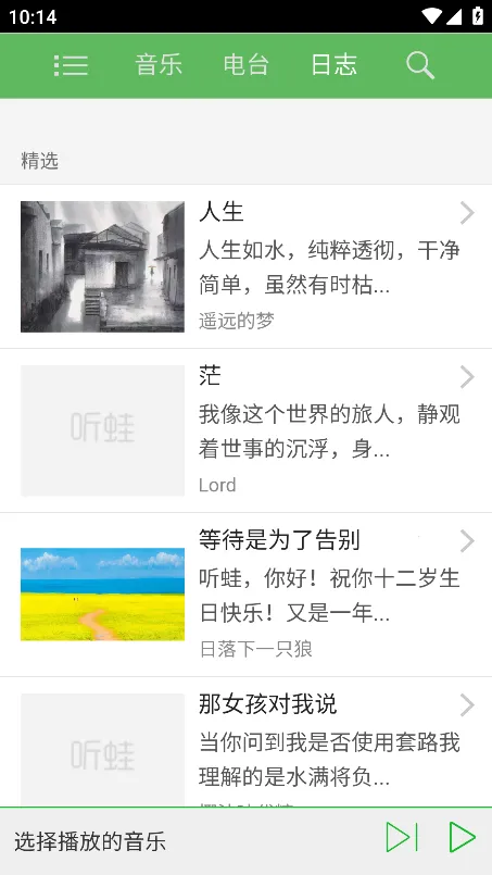 你是否想知道“听蛙声一片”的上一句是什么?有这样一款软件或许能帮到你。它不仅是个音乐平台,还能成为你探寻知识的小助手。在听蛙app里,海量曲库丰富多样,从古典到流行,从摇滚到民乐,各种风格应有尽有。它能精准推荐你可能感兴趣的音乐,比你还懂你。超清音质让你畅享美妙旋律,不会为音质担忧。音乐分类细致,可按乐器、曲风、心情、音乐人等维度查找,比如能找到古典的钢琴、小提琴曲,流行的各类热门歌。还有音乐精选、歌单以及音频电台等功能。在这里,你不仅能沉浸在音乐世界,说不定还能在探索音乐的过程中,找到“听蛙声一片”的上一句,满足你对知识和音乐的双重需求,快来下载体验吧。
