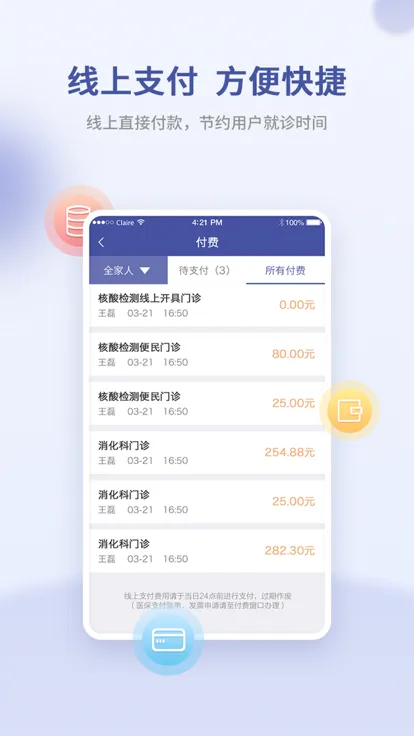 2. 支持线上支付,挂号费、药品费等医疗服务费用都能快捷支付。